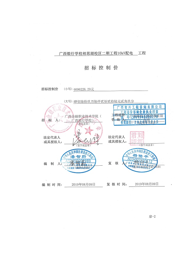 广西银行学校相思湖校区10KV配电工程(二期)[项目编号:项目编号:GXZC2019-G2-26009-GXJT]招标控制价公布如下:
